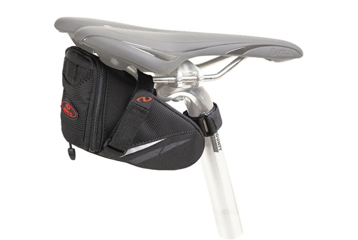 Stromlinienförmige Satteltasche mit großem Hauptfach und Klettverschlußbefestigung.